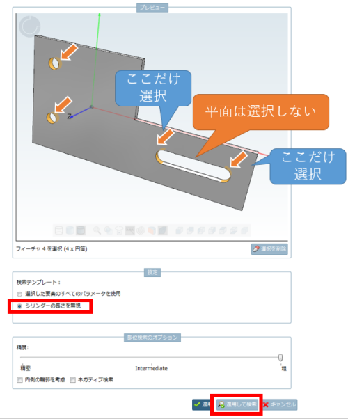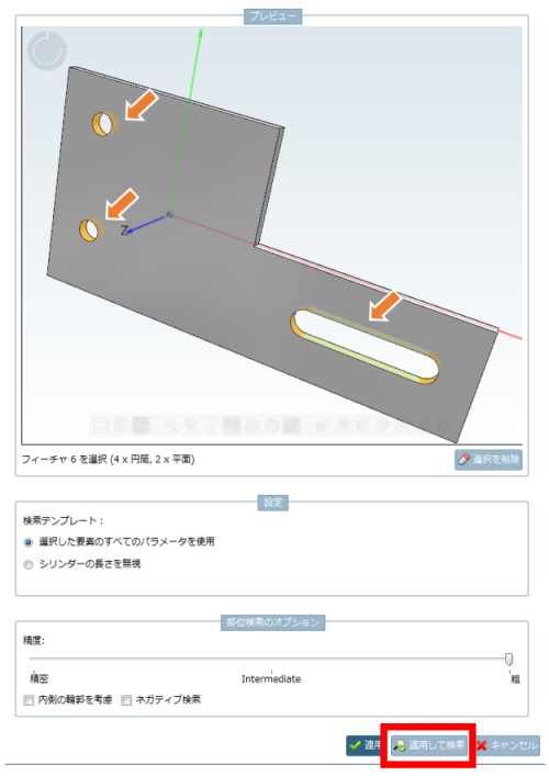 以下の図のように、検索したい穴を選択します。穴を選択することで穴の直径、穴の深さ、そして穴の間隔も検索条件に考慮されます。選択が完了したら「適用して検索」ボタンをクリックします。