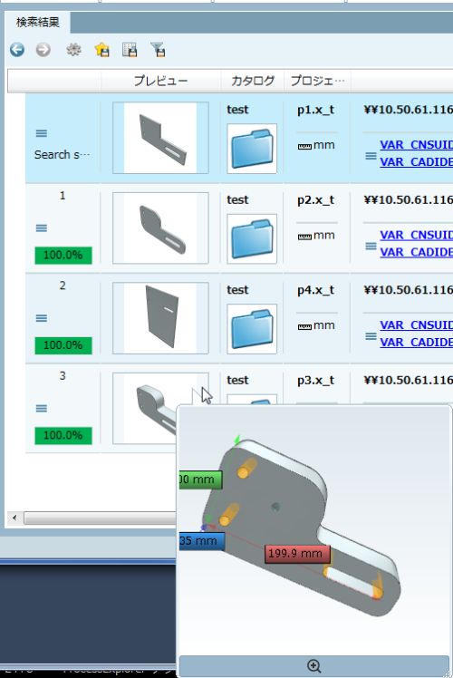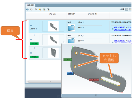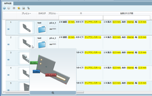 検索結果内の部品のプレビューにマウスカーソルを重ねると、3Dプレビューツールチップが表示され、3Dプレビュー内でどの部分がヒットしたかマークされます。