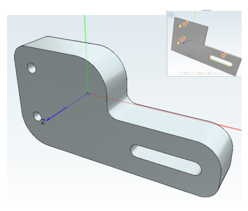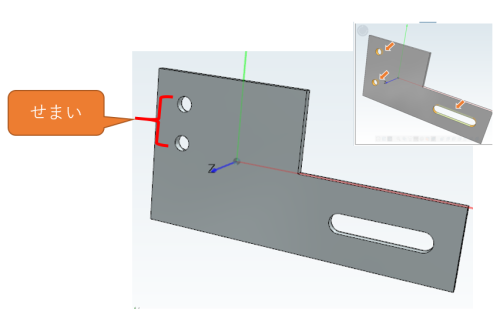 このような場合「設定」のオプションで「シリンダーの長さを無視」を選択します。これで穴の長さを無視します。ただしこの場合で長穴を選択する場合は少しコツが必要で、図のように平面部分は指定しません、指定すると「シリンダー」にならないので長さも考慮されてしまいます。左右の円弧部分のみを選択します。この左右円弧の幾何的配置は考慮されます。