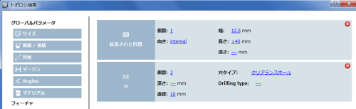 単に「D=10,L=5の穴を2個持つ部品」を探すという場合、「部位検索」でも「トポロジ検索」でも探すことができますが、前者は穴の幾何学的配置も考慮され、後者はされずとにかく指定された条件( D=10,L=5の穴を2個持つ)に該当する部品を検索する、という違いです。