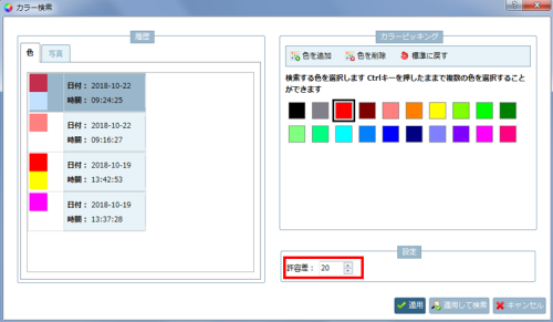 ⇒「赤くて、、、」を指定します。下部の「許容率」はRGBの幅を指定できます。例えば赤はRGB「255:0:0」ですが、許容率「0」ですと、少しでも違っている場合検索されませんので、ある程度幅を持たせることで検出されやすくなります。この例は許容率「20」ですが、その場合