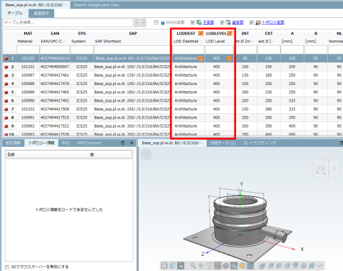 すべてのカタログというわけではありませんが、一部のカタログは3Dモデルの詳細レベルを設定できる製品データを含んでいます。その場合、パーツビューのテーブルに「LODDEST」カラムと「LODLEVEL」カラムが表示されています。