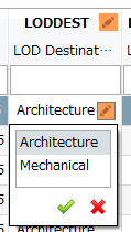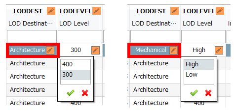 「LODLEVEL」は、前のカラム「LODDEST」の選択により値候補が変化します。「LODDEST= Mechanical」の場合(画像右側)は、High(高)、Low(低)などです。「 LODDEST= Architecture 」の場合(画像左側)は、300、400等で、これはBIMフォーラムの「 LOD 仕様書 」に沿った形の標準的な詳細レベルです。上記画像は選択肢が「300/400」または「High/Low」のみですが、これは製品により異なります。
