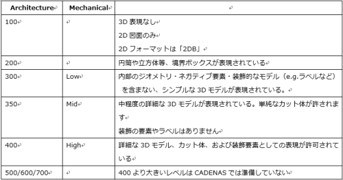 「LODDEST」の値候補は、「Mechanical」または「Architecture」の2択です。これは次の「LODLEVEL」カラムで指定する詳細レベルの指定方法の選択です。「Mechanical」はメカニカルCAD用、「Architecture」の場合、Autodesk Revit等建築用のBIMモデルとしてCADデータを取り出す場合です。
