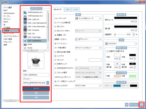 2.「設定」ダイアログ左側で「3D設定」を選択します。その後「テンプレート」エリアから適用したいスタイルを選択して「ロード」ボタンをクリックします。