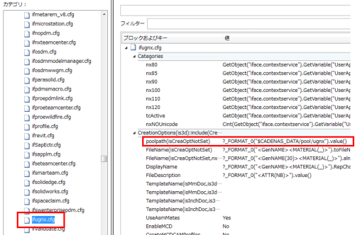 PARTadminを起動し、「PARTsolutions」>「設定ファイル」>「CADENAS_SETUP」>「if<cadname>.cfg(今回はifugnx.cfg)」>[CreateOptions(is3d)]>poolpath キーを選択します。