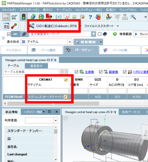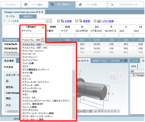 PARTsolutionsから転送されるCADデータに、材料特性をつけることができます。正確にはCADが持つ材料ライブラリの材料を割り当てることができます。JIS等標準規格部品のデータは材料が規定されていないので、使用するときに材料を指定する、という使い方が主です。