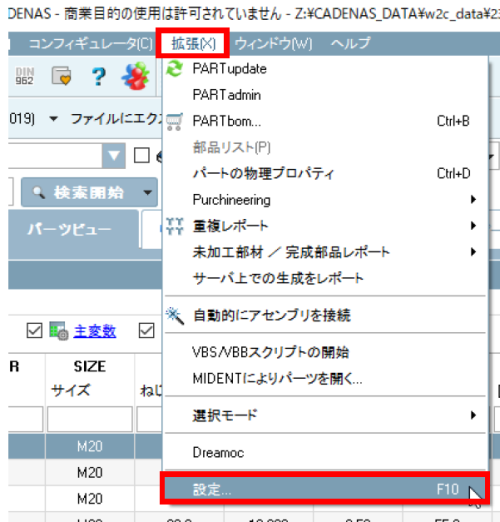 標準では非表示ですので、使用するには設定を行います。PARTdataManager メニューの「拡張」>「設定」を選択します。