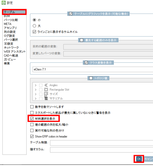 「テーブル」>「材料選択を表示」にチェックを入れます。