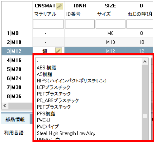- キー:左側の「キー」(Copper、Stailess Steel, Austenitic)は、PARTsolutions の材料属性の内部名です。PARTsolutions の材料属性は「CNSMAT」カラムの選択リストです。