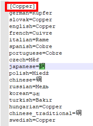 例えば、「銅」をマッピングする場合「銅」の内部名を調べます。エディタ等で上記ファイルを開き「銅」で検索します。このときのブロック名(Copper)が内部名です。