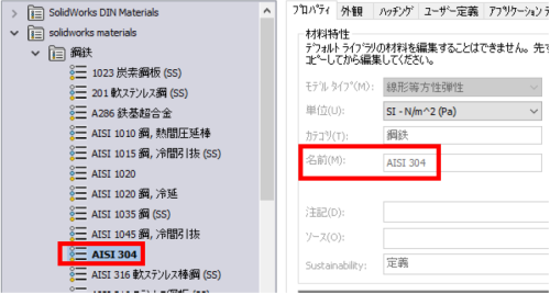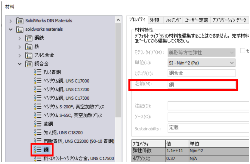 値:右側の値は、SolidWorks の材料ライブラリの材料名です