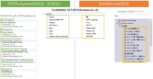左側( Copper、Stailess Steel, Austenitic )がキーで、PARTsolutionsの材料名で、右側(銅、AISI 304)がSolidWorks側の材料ライブラリの材料名です。デフォルト設定はSolidWork 側の記述が合っていないので、原則編集あるいは追加して独自に設定することになります。