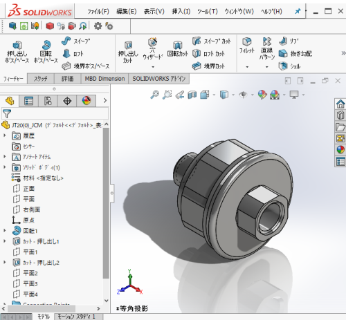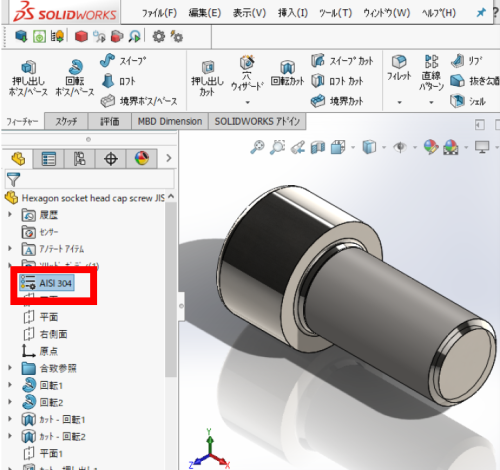 生成されたCADデータの材料を確認します。指定した材料「ステンレス(オーステナイト)」(SolidWorks側ではAISI 304)が割り当たっています。