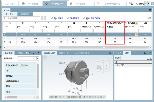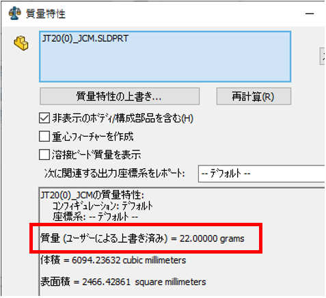 重量を確認します。PARTsolutionsから「22g」が転送されています。