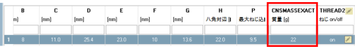 一部の部品は「CNSMASSEXACT」というカラムを持っており、これが重量情報になります。