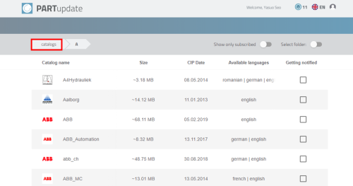 ログイン後の画面遷移直後は頭文字「A」のカタログリストが表示されます(異なる場合もあります)。