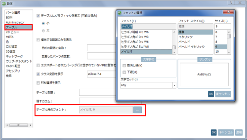 PARTdataManagerで、メニューバーから「拡張」>「設定」>「テーブル」>「テーブル用のフォント」を選択します。テーブルとリストビューで表示される属性のために使われるフォントを適宜設定できます。