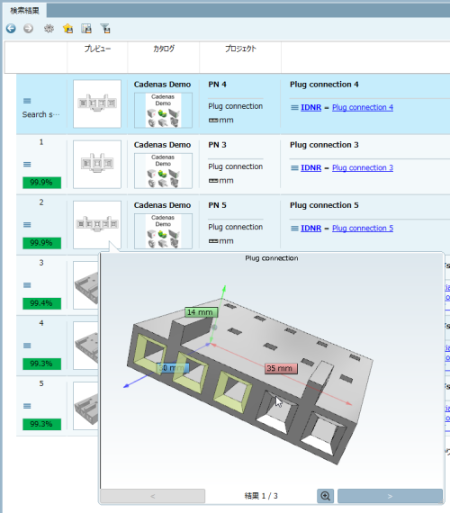 検索結果です。選択された部品より多くのコネクタをもつ部品もヒットします。このように、検索時に選択された面の形状はもちろん、その他関係性(間隔、角度など)も検索条件となります。上記の例の場合、12の平面が選択されていますが、その一つ一つの位置関係や角度等も検索条件として加味されているというわけです。