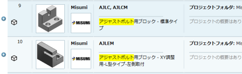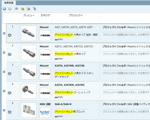 しかし、同じように使用できる部品であっても、そのすべてが同じ名称・用語が使用されているとは限りません。「アジャストボルト」でテキスト検索すると、「アジャスタボルト」「アジャスタ」「高さ調整ボルト」などは除外されます。