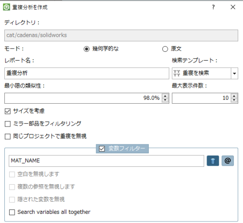 このフィルターを設定することで、形状が類似しかつ材料が一致する部品のみを「重複」として分類します。