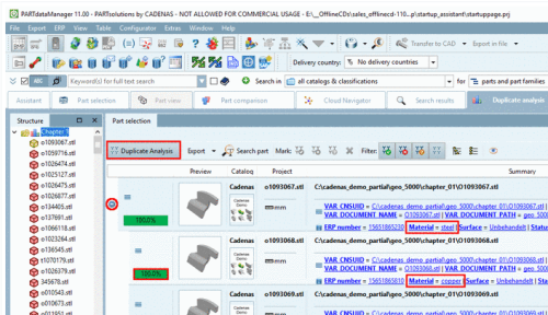 部品管理で「重複分析」を利用する場合、材料などの配慮が重要になります。 通常は形状(とサイズ)のみを基準とするので、例えば同一形状の材料違いの部品の場合、形状自体はほぼ同一ですので「重複」と分類されてしまいます。しかし、材料違いは別部品であるので「重複」には含めたくない、逆に形状が類似し、かつ、材料が一致する部品だけを「重複」としてレポートしてほしい、こんな要求を実現する方法です。