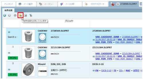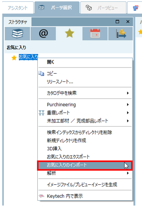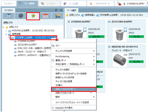 3.「パーツ選択」のお気に入りエリアに保存した検索結果が表示されるので、選択後右クリック>「お気に入りのエクスポート」を選択します。