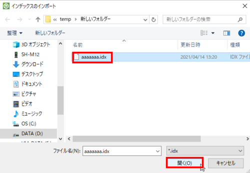 6.「インデックスのインポート」ダイアログが表示されるので、受け取ったidxファイルを選択して「開く」をクリックします。
