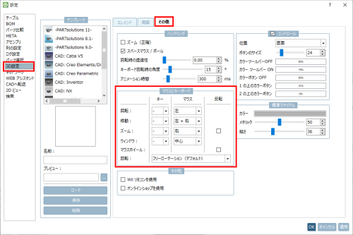 PARTdataManager起動後、メニューの「拡張」>「設定」>「3D設定」>「その他」タブ>「マウスとキーボード」エリア内の各設定で、マウスとキーの動きをを自分で定義できます。
